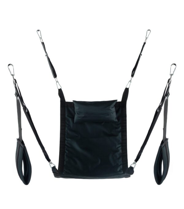 Voilà un sling en tissu noir avec tous les accessoires : les suspensions avec les mousquetons en métal les supports pour pieds rembourrés (largeur de 11cm) le coussin (23 x 38cm). Le sling est de forme rectangulaire. Dimensions : 60cm X 107cm. Matière : polyesterAvec le sac de rangement