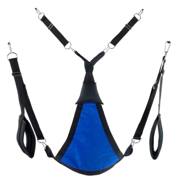 Ce sling en tissu bleu est réalisé avec une forme Triangle. Il est accompagné des accessoires : les 4 suspensions avec les mousquetons en métal les supports pour pieds rembourrés (largeur de 11cm) le coussin triangle noir (24 x 20cm) le sac de rangement. Dimensions : 64 x 115cm. Matière : polyester