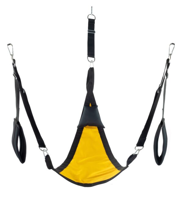Ce sling en tissu de la marque Mr Sling est composé d’une forme en triangle avec une toile jaune.Il se place par 3 ou 4 points d’attache. Il est livré avec les accessoires : les 4 suspensions avec les mousquetons en métal les supports pour pieds rembourrés (largeur de 11cm) le coussin triangle noir (24 x 20cm). Dimensions : 64 x 115cm. Matière : polyester Avec le sac de rangement