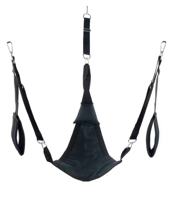 Ce sling en tissu de la marque Mr Sling est conçu avec une toile noire en forme de Triangle.Le kit se compose de : le sling de 64 x 115cm les 4 suspensions avec les mousquetons en métal les supports pour pieds rembourrés (largeur de 11cm) le coussin triangle noir (24 x 20cm). Matière : polyester Avec le sac de rangement