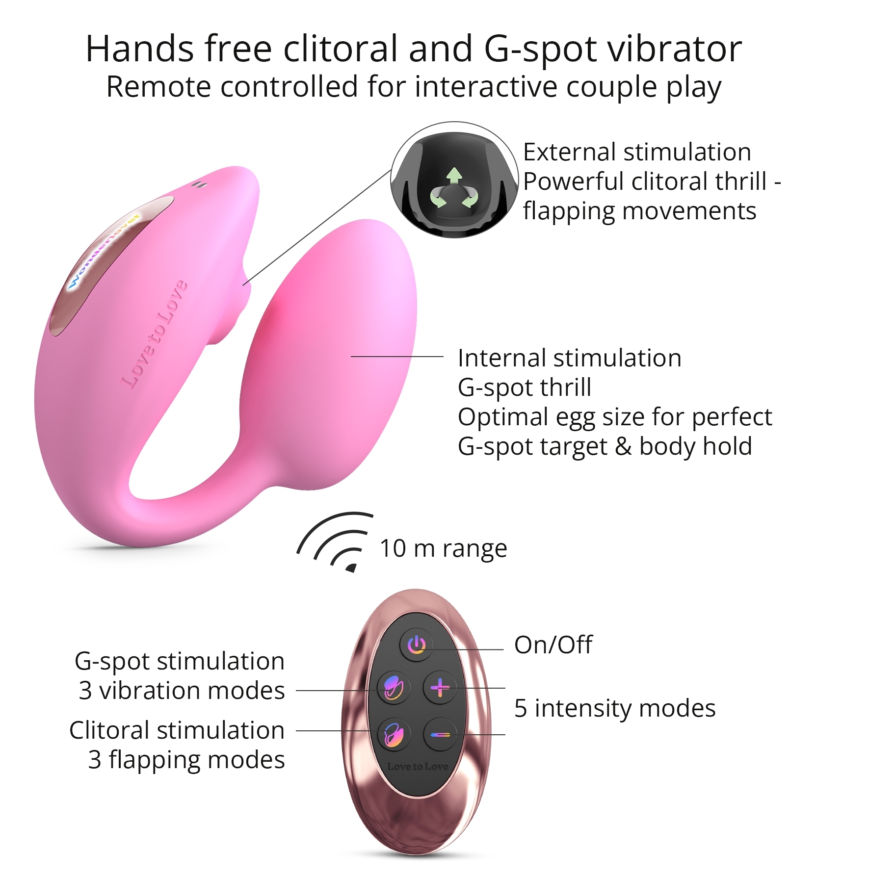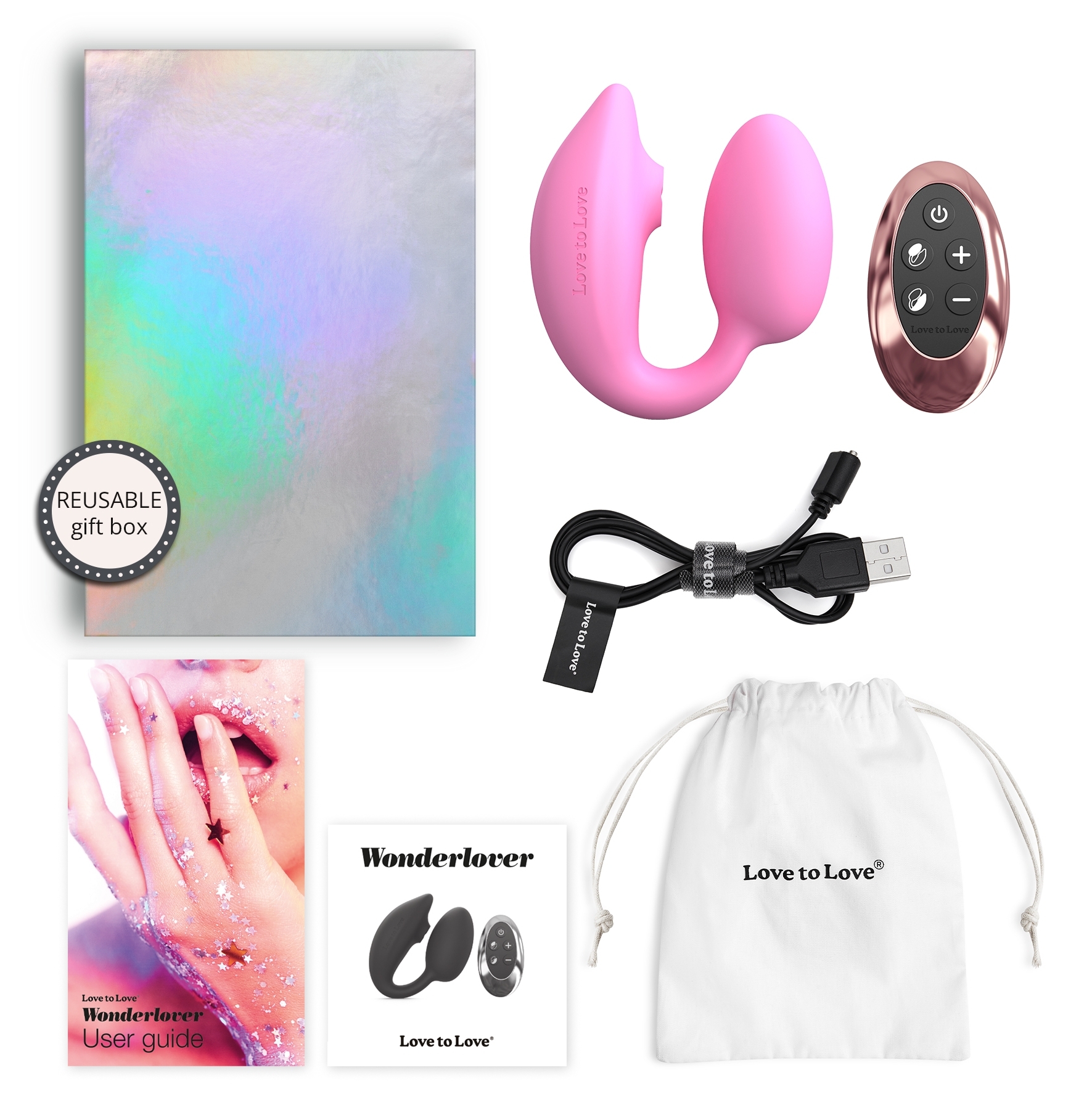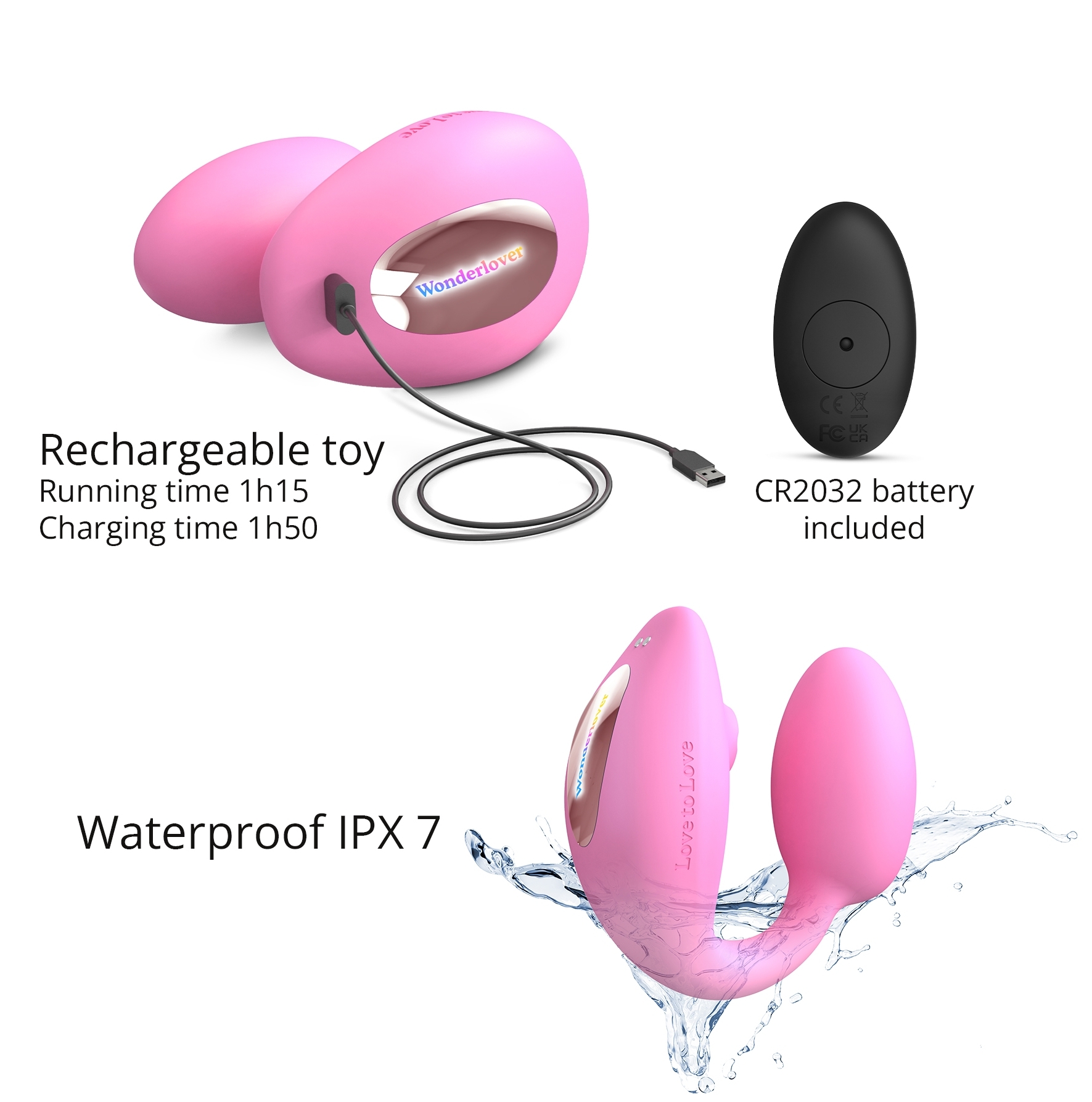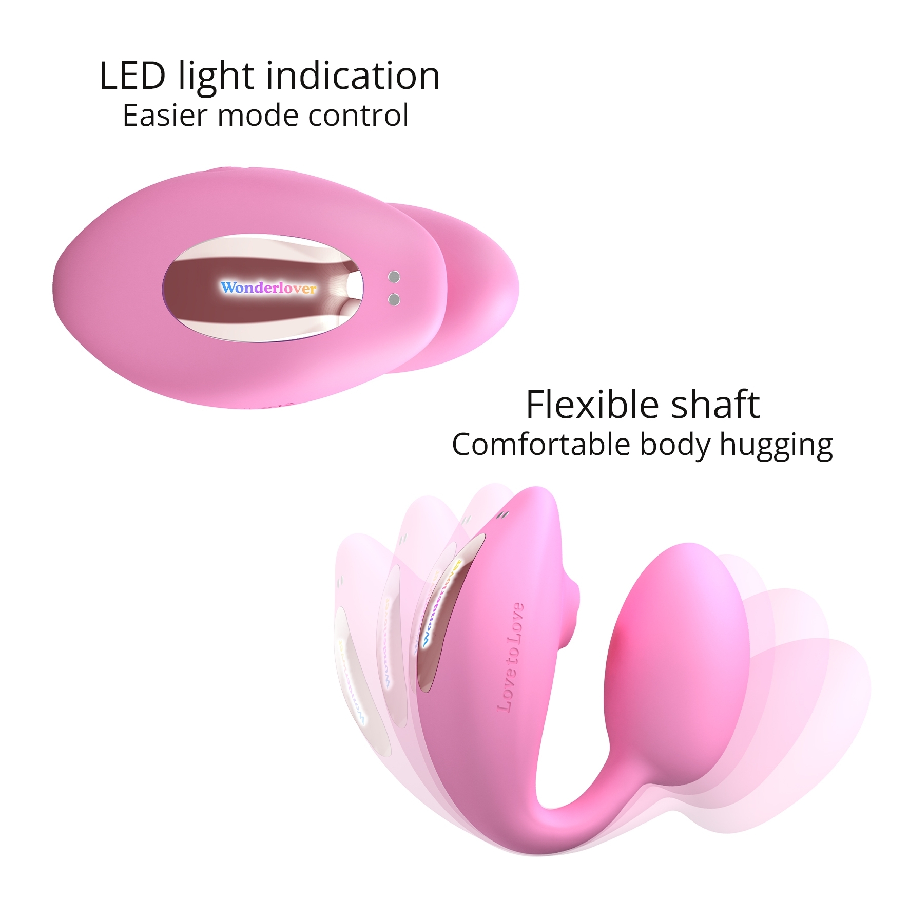 Le Wonderlover est un stimulateur pour le point G et le clitoris.Il se compose d’un oeuf vibrant de 9.8 x 3.9 cm et d’un stimulateur de clitoris par succion. Avec 3 modes de vibrations et succions. 5 vitesses par mode (avec télécommande).L’écran rétro-éclairé est pratique. En silicone