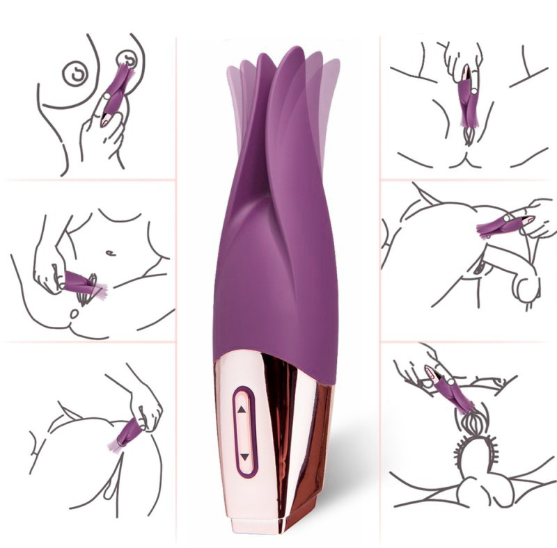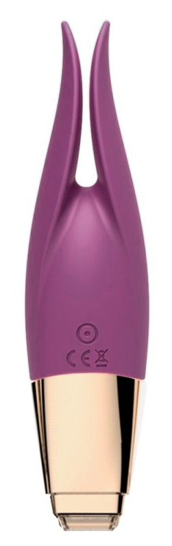 Stimulateur de clitoris avec 10 modes de vibrations. Longueur totale de 15 cm et largeur maximale de 3 cm. En silicone