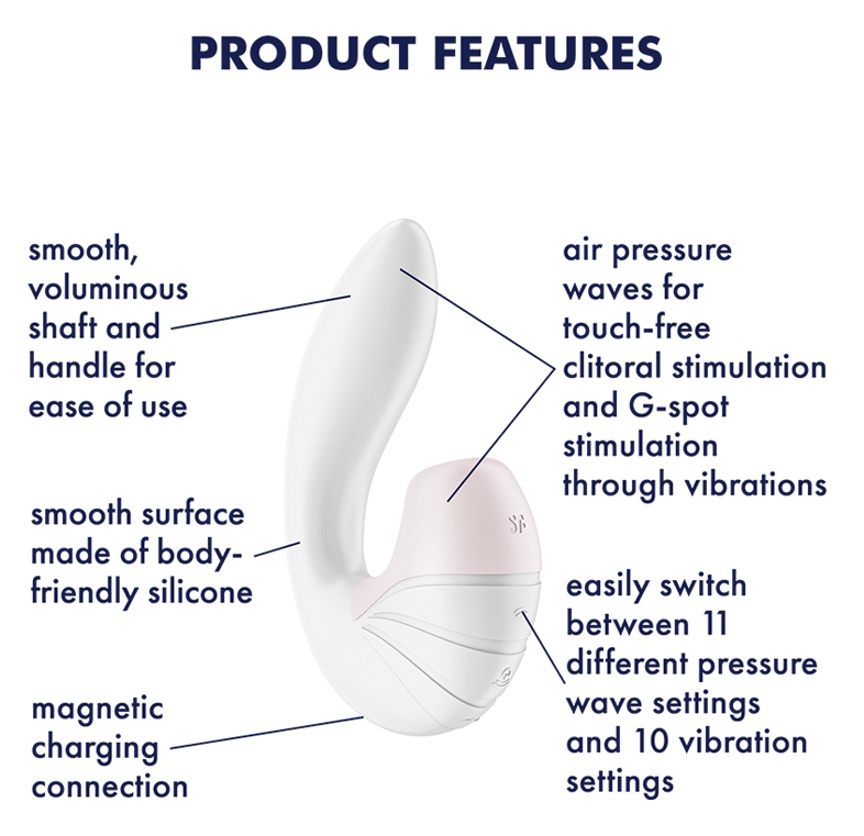 Ce sextoy de la marque Satisfyer est composé de : un embout qui enveloppe le clitoris et diffuse 11 modes d’ondes vibratoires le dildo pour le Point G avec des dimensions de 10 x 3cm (12 modes de vibrations). Avec une structure souple et 2 moteurs indépendants