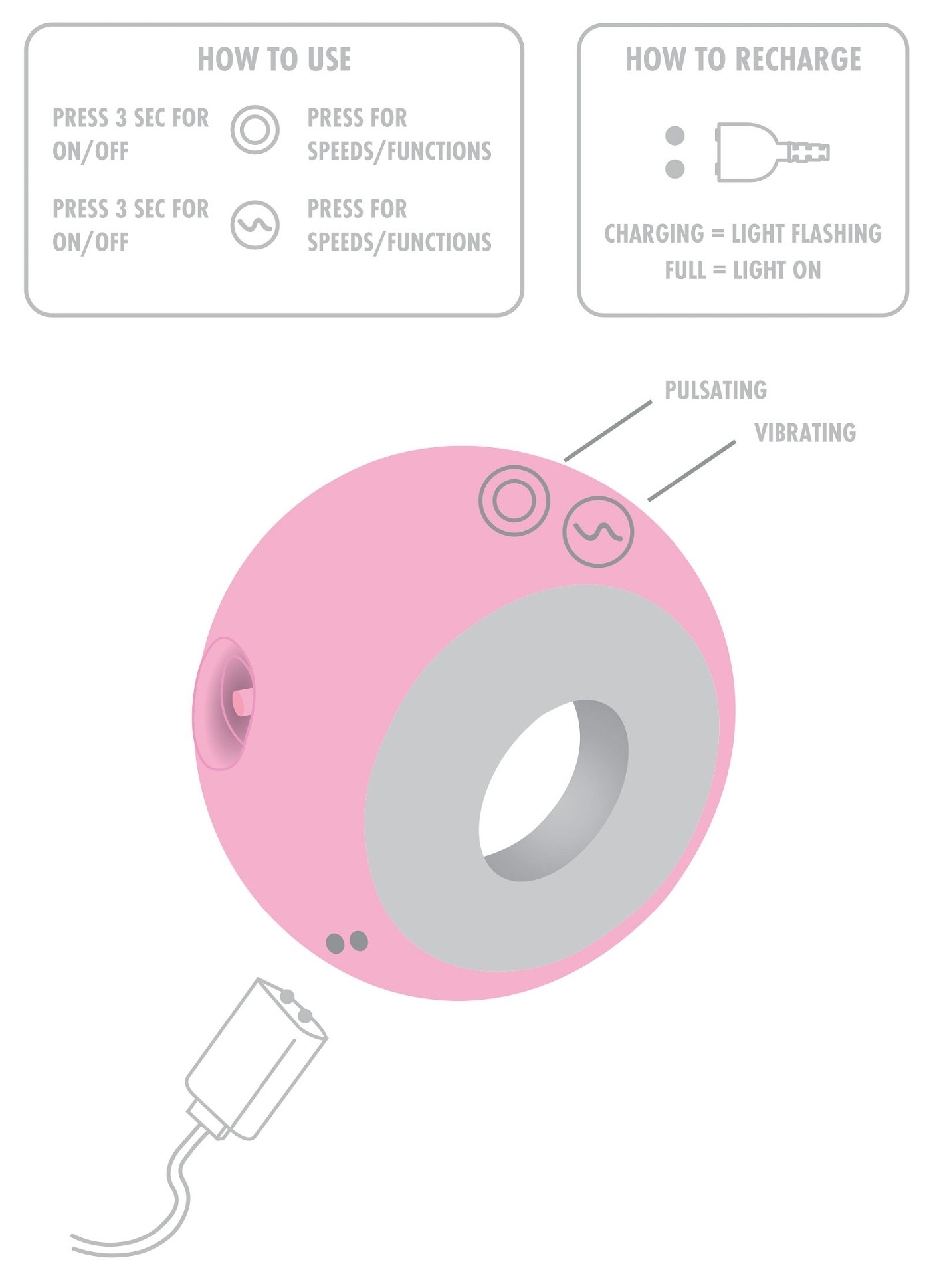 Caractéristiques : Diamètre 7.5 cm Largeur 3 à 4.3 cm 7 rythmes 3 vitesses Rechargeable — batterie lithium Étanche Silencieux En silicone Conseils d’utilisation : le nettoyer avant et après l’utiliser, uniquement, avec du lubrifiant à base d’eau le conserver dans un endroit sec et propre, à l’abri de la lumière et de la chaleur, sans contact avec d’autres objets.