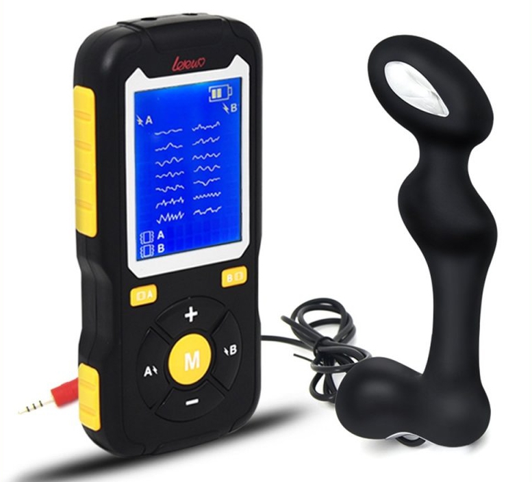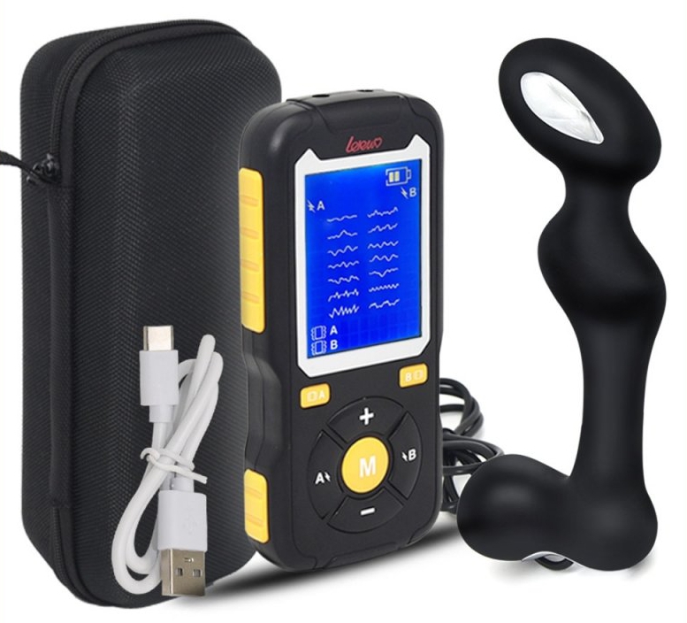Mode d’emploi : Brancher le stimulateur de prostate sur la sortie A ou B Allumer le contrôleur en appuyant 3 secondes sur le bouton « M » (idem pour l’éteindre) Fonctionnement des vibrations : Appuyer sur le bouton de sortie correspondant / Presser le bouton « M » pour changer la fréquence de vibration / Appuyer sur « + » ou « – » pour changer l’intensité de vibration Fonctionnement de l’électro : Appuyer sur le bouton « Éclair » avec la lettre de la sortie correspondante / Presser le bouton « M » pour changer la fréquence de vibration / Appuyer sur « + » ou « – » pour changer l’intensité de vibration. Caractéristiques : Batterie Lithium – recharge USB Autonomie 120 minutes Temps de charge 120 minutes