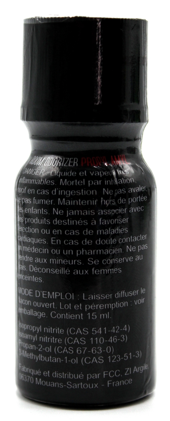 Précautions d’utilisation: Produit inflammable – ne pas mettre en contact avec une source de chaleur Ne pas ingérer Éviter le contact avec la peau, les yeux et les muqueuses En cas de problèmes, contacter un médecin ou appeler le centre anti-poison le plus proche Tenir hors de portée des mineurs Conserver dans un endroit frais et ventilé Ne pas utiliser avec des stimulants érectiles ni en cas de problèmes cardiaques, vasculaires ou d’insuffisance respiratoire Composition : Isopropyl Nitrite (CAS 541-42-4), Isoamyl Nitrite (CAS 110-46-3), Propan-2-ol (CAS 67-63-0), 3-Methylbutan-1-ol (CAS 123-51-3)