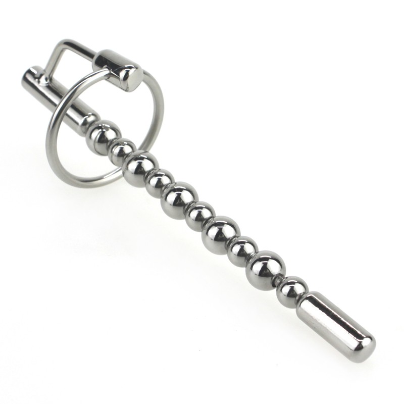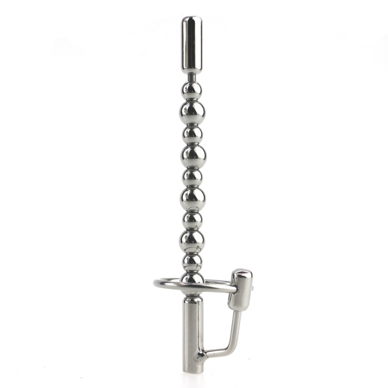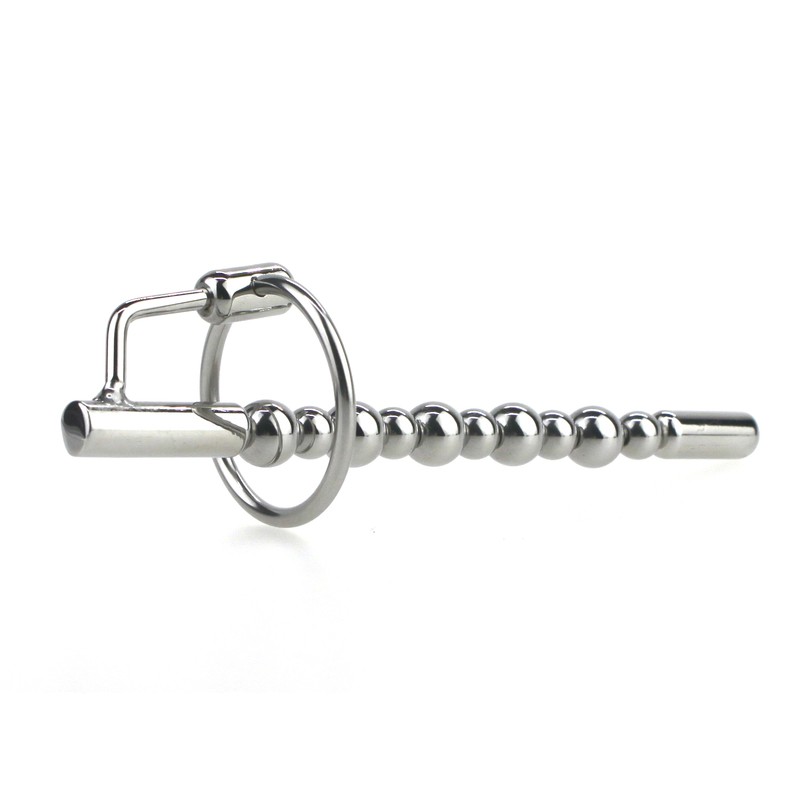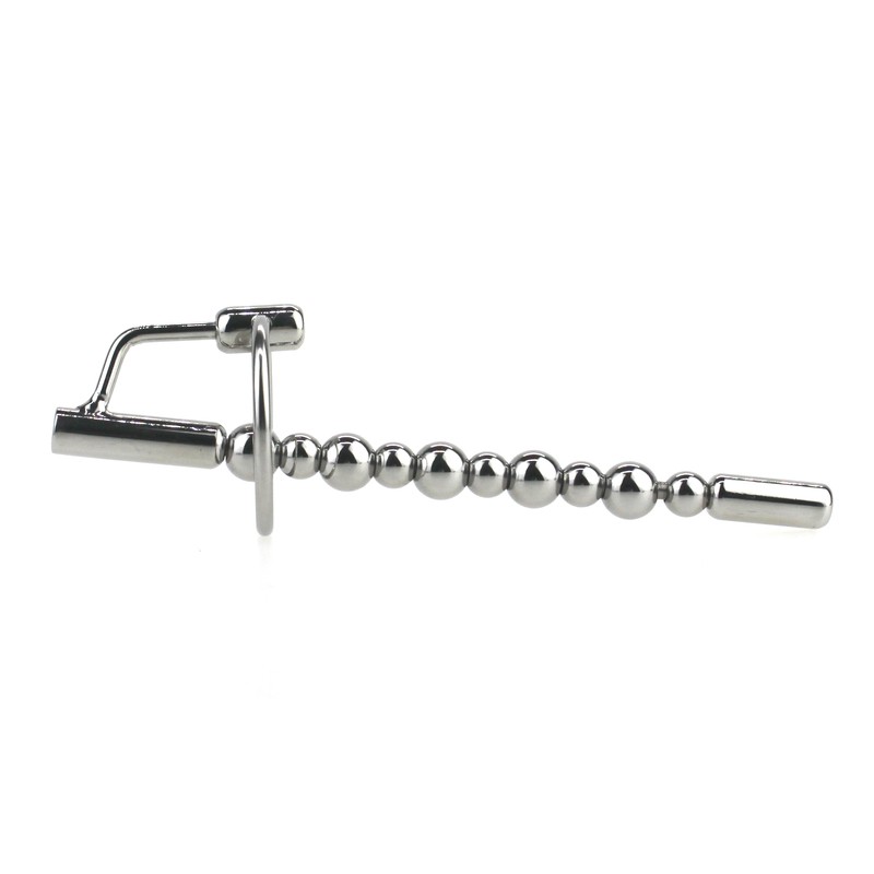 Tige à urètre de 10cm de long muni d’un anneau de gland qui la maintien dans l’urètre. Diamètre 2.5 et 3cm pour ajuster à la taille du gland.Le diamètre de la tige est compris entre 6 et 10mm avec un relief en forme de boules successives. Insertion à faire avec un lubrifiant adapté