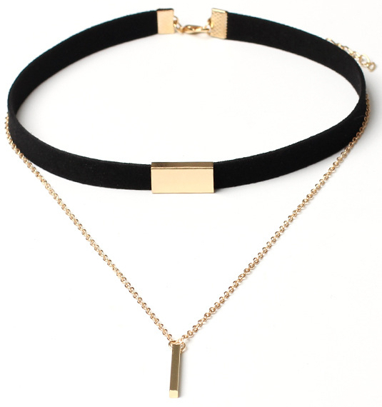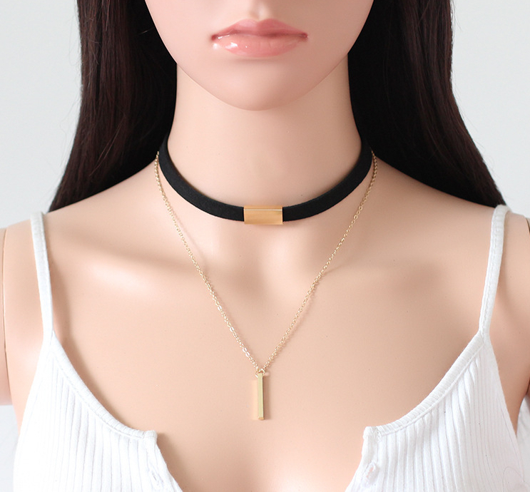 Tour de cou en daim noir avec un petit pendentif rectangulaire doré Petite plaque dorée sur le tour de cou Ajustable de 31 à 41 cm. En daim noir et métal doré