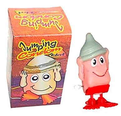 Accessoire composé d’une forme de pénis avec une capote non déroulée.Mécanisme qui permet de le faire sauter